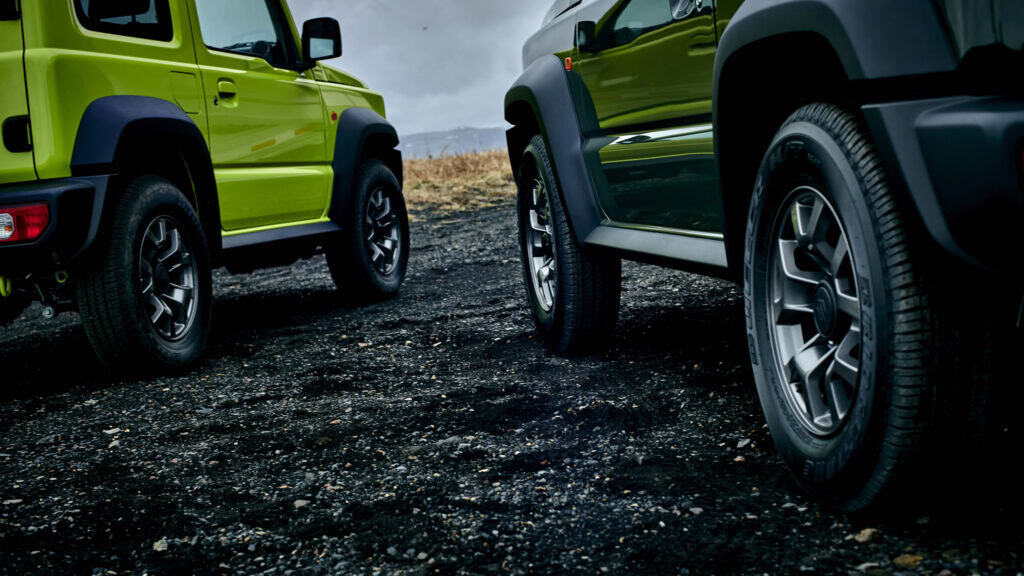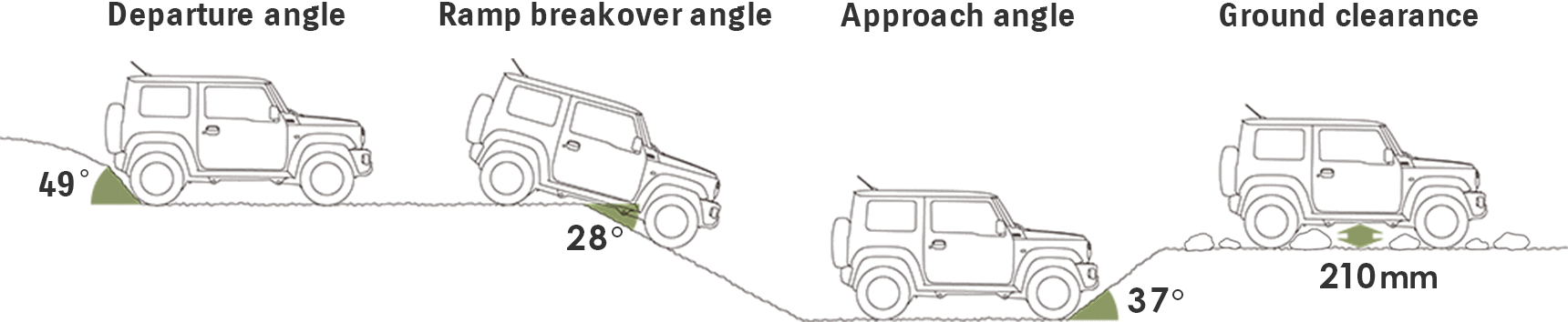 Jimny pomjera granice terenske vožnje zahvaljujući velikim prilaznim, odlaznim i prelaznim uglovima, kao i visokom razmaku od tla. Ove karakteristike omogućavaju sigurno savladavanje strmih uspona, oštrih nizbrdica i prepreka, bez dodirivanja branika ili donjeg dijela vozila.