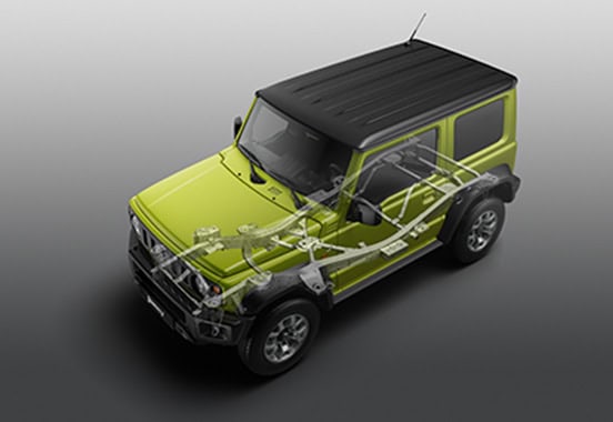 Još od prve generacije, Jimny je opremljen krutom šasijom na okviru koja predstavlja čvrstu osnovu za ozbiljne terenske performanse. Ovakva konstrukcija osigurava izdržljivost, stabilnost i pouzdanost pri vožnji po zahtjevnim i neravnim terenima.